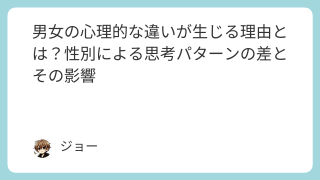 「なんで男と女はこんなに考え方が違うんだろう?」と思ったことはありませんか?恋愛や仕事、友人関係でも、男女で意見がかみ合わずにモヤモヤする場面は多いですね例えば、「男性は問題を解決しようとするのに、女性はただ話を聞いてほしいだけだった」とか...